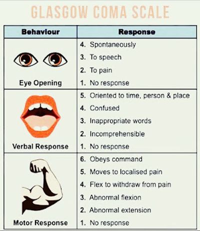 Each of these three parts gets a score, and then those scores are added up to get a total score. The highest possible score is 15, which means the person is fully awake, aware, and responsive. The lowest score is 3, which means the person is in a deep coma and not responding at all.