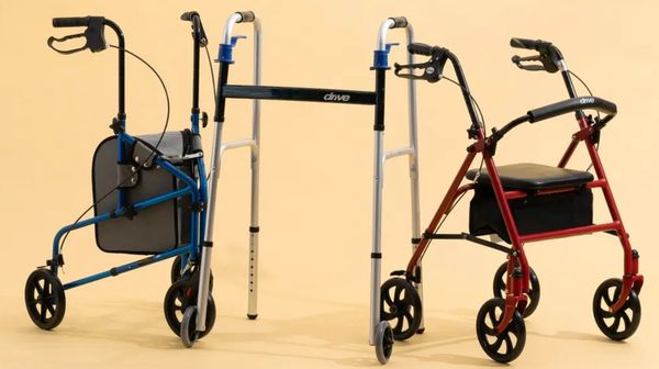 A walker is a mobility aid device with a metal frame and four legs that provides support and stability for individuals who have difficulty walking independently. Users grasp the handles of the walker and move it forward as they walk, helping to improve balance and reduce the risk of falls.