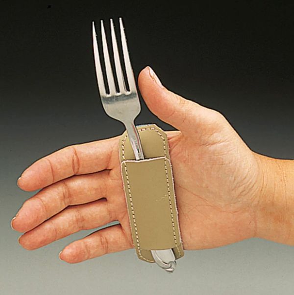 This is a hand strap that secures feeding and hygiene products for people who may lack the grasp strength and fine motor coordination.