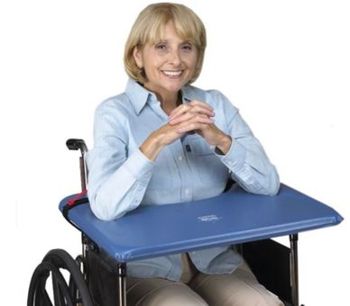 A secured lap tray allows the patient to safely sit out of bed and move around the environment in the wheelchair. It also provides upper extremity support and minimal postural support.