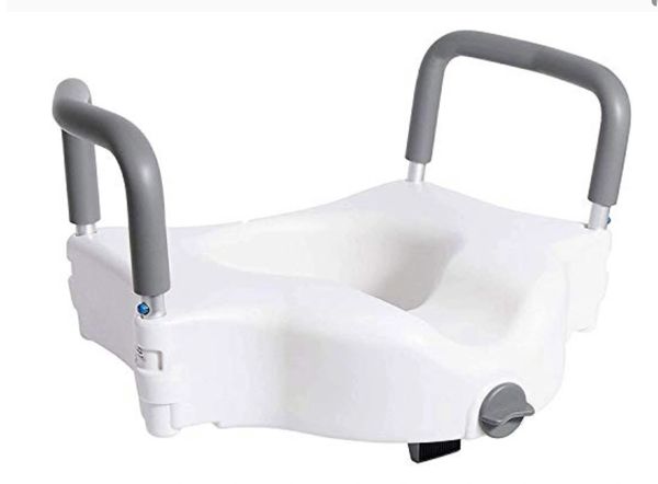 This can come with or without side rails to assist with standing from the toilet. This has a clasp to secure the raised toilet seat.