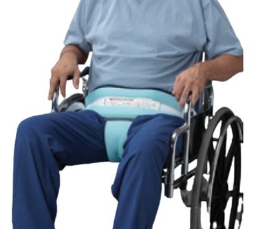 The pelvis posey is also used to allow a patient to safely sit out of bed and move around the environment in their wheelchair. It prevents them from standing up by themselves. The difference between the pelvic posey and the rear closing seatbelt is that the pelvis posey also offers an element of positioning if the patient has a tendency to slide forward in the wheelchair.
